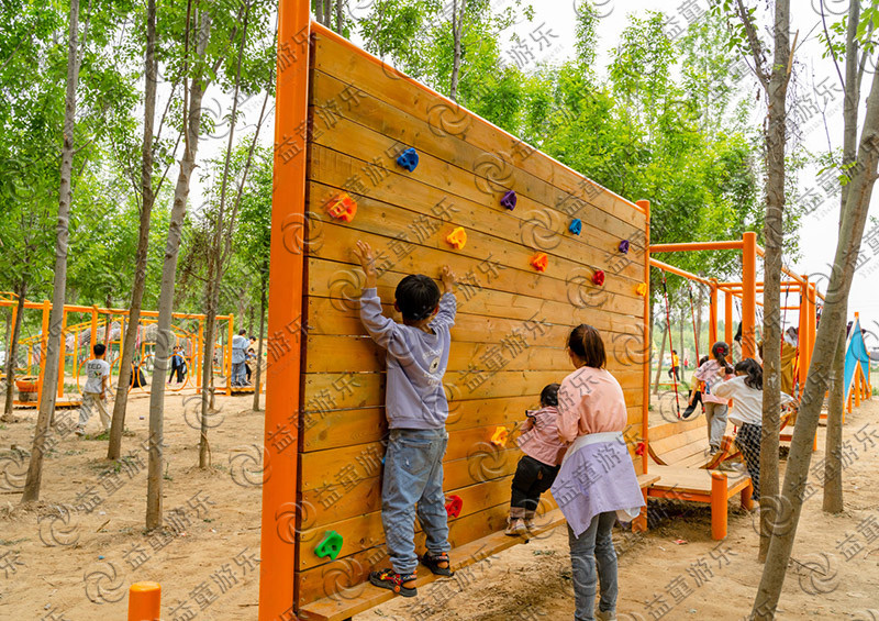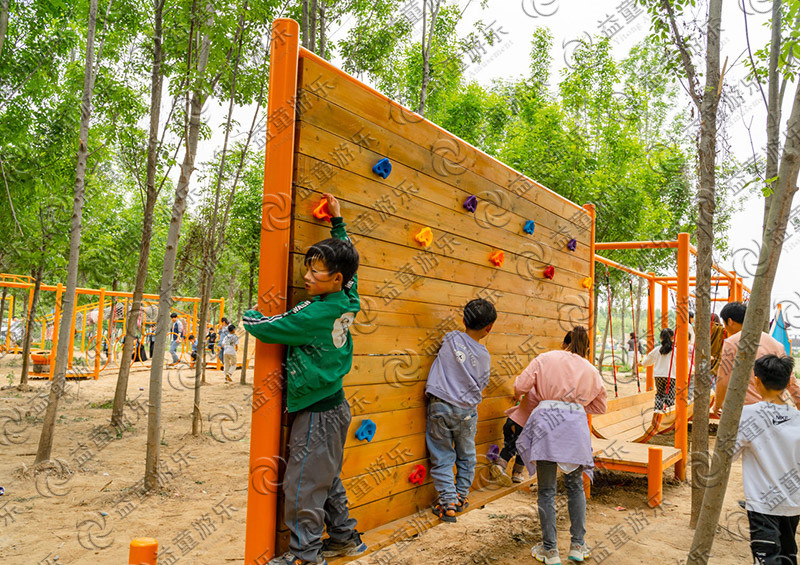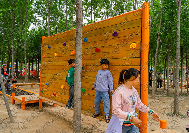 这款设备叫木攀岩,用木材搭建而成,小朋友们在通过的时候需要身体紧贴上面,手指抓紧上面的着力点,脚踩着窄小的木板路,每次在前行的时候手抓着上面的攀岩岩点,缓慢通过,这个比较考验臂力,一不小心就会掉下去。