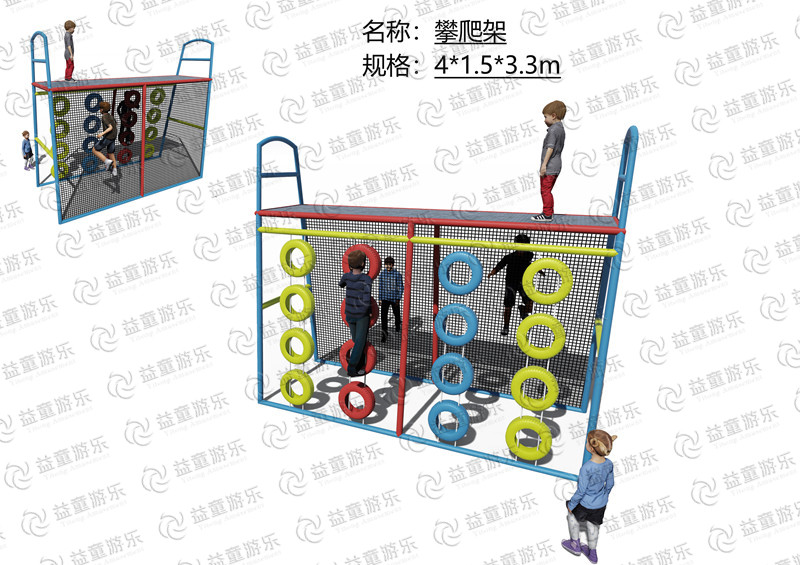 攀爬架一面是绳网,一面是轮胎。可以从轮胎一侧上去,也可以从网面一侧上去,在上面孩子们需要保持住身体的平衡,从另一侧爬下来,既能让孩子体验乐趣又锻炼了思维能力和身体素质。位置不同,体验感觉也不同。