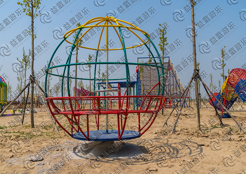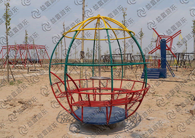 太空球形似球体,且中间有模拟方向盘,其玩法非常简单。太空球中间圆柱上有一个方向盘,坐在太空球里面的凳子上,手动转动方向盘让太空球转动即可。