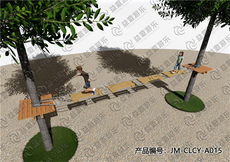 丛林bt365手机备用网址_Bet—288365_365bet娱乐场平台 器材-A015是丛林bt365手机备用网址_Bet—288365_365bet娱乐场平台 器材中较为简单的一款,主要由N块防腐木相连而成。三根钢丝绳在下方作为支撑,先有两根木板为一组横着在钢丝绳上,然后两根木板竖着在两根横着的木板上方。这个项目简单易操作,是大人儿童都能玩的项目。