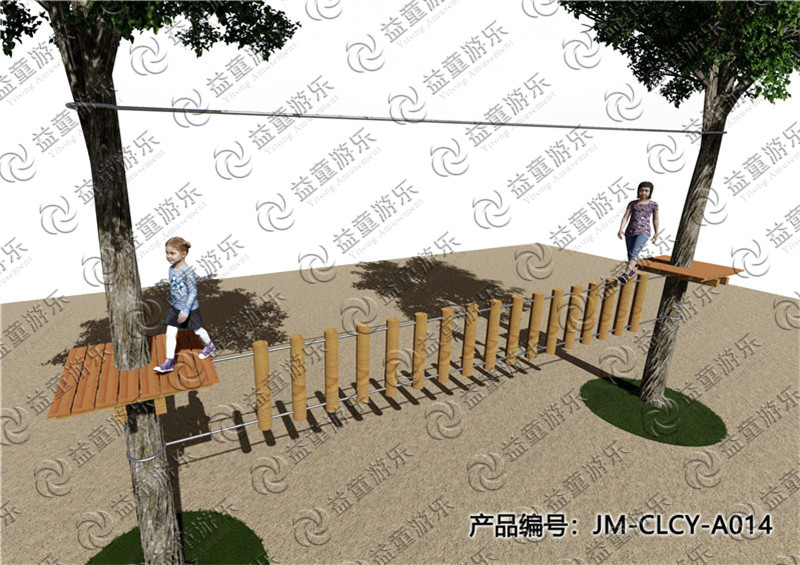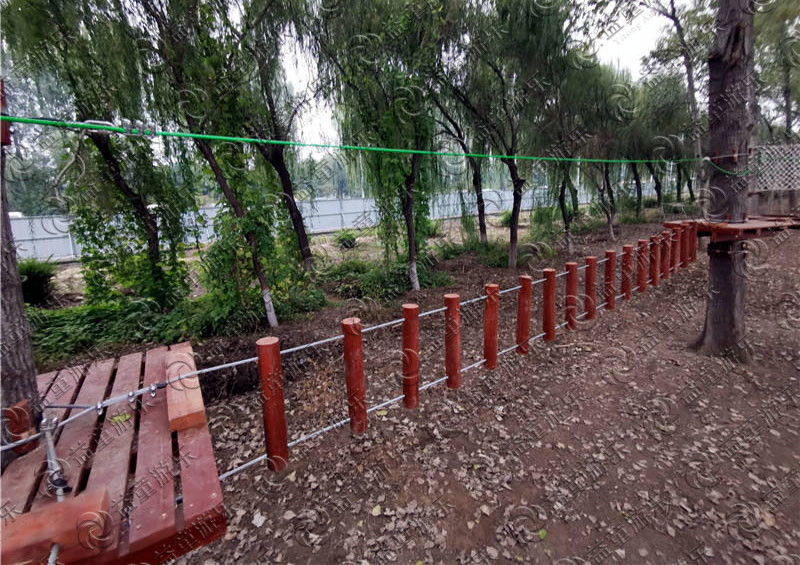 丛林bt365手机备用网址_Bet—288365_365bet娱乐场平台 器材-A014该项目主要由木柱和绳索组成,长长的木柱垂直地面,两根绳索横穿所有木柱,用于固定。游客游玩时,需要手扶上方钢丝绳,脚踩下方的竖着的细圆柱形防腐木,能够很好地锻炼平衡力。
