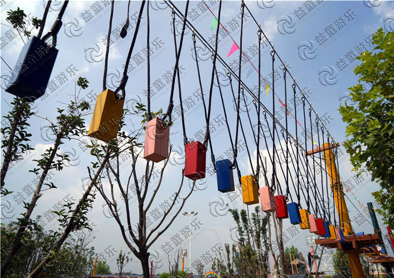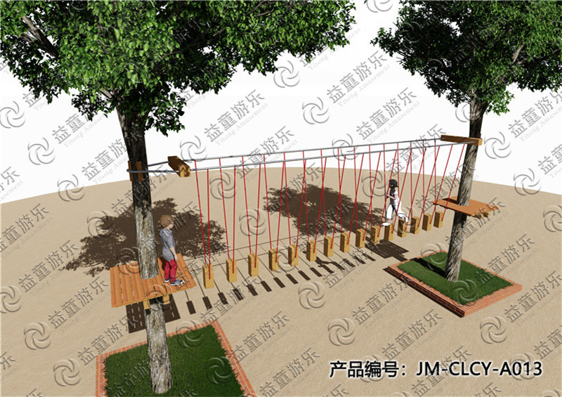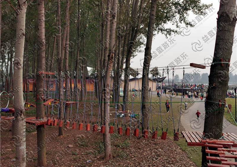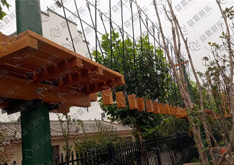 丛林bt365手机备用网址_Bet—288365_365bet娱乐场平台 器材-A013是在大树之间设置的运动绳索、软桥或绳网等有挑战的项目,使人们在绳网上摇摆和嬉戏,从一棵树到另一棵树上摆动的吊桥。游客需要手扶绳索,脚踩在木柱上,从这个木柱到另一个木柱上,整个过程惊险刺激,看着就让人忍不住想去挑战。