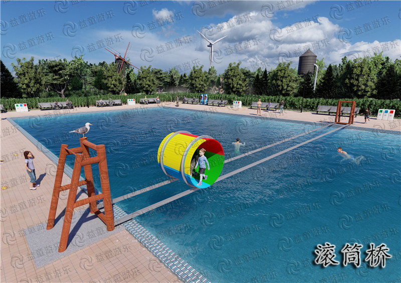 滚筒桥作为水上拓展设备,以其构造简单、玩法简易而广受孩子们欢迎,滚筒桥通常大型及小型两种,滚筒一般可以容纳一到两个人,其造型很像地面上的轨道滚筒,游客在滚筒桥里面双手扶着滚筒壁跟着节奏向前行,孩子们会觉得又惊喜有好玩的,增加了孩子们的乐趣!